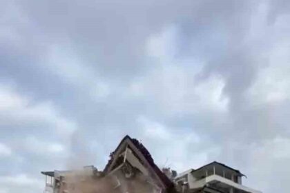 Hatay’ın Defne ilçesinde iş makinesiyle kolonlarına zarar verilen 7 katlı binanın korna…