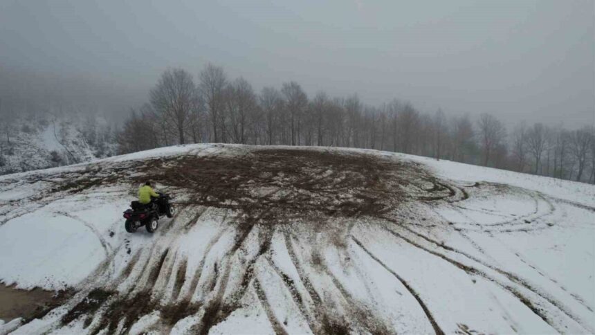 Meteoroloji Genel Müdürlüğü’nün uyarıları sonrasında Sakarya’da kar yağışı etkili oldu. Yağış ile birlikte beyaz örtüyle kaplanan Kırcaali Yaylası mevkiinde kartpostallık görüntüler ortaya çıktı. Seyrine doyumsuz manzaranın oluştuğu bölgede motosiklet ve ATV ile yapılan Off-Road keyfi dron ile görüntülendi.