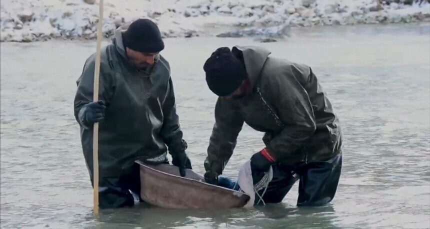 Ağrı’nın Diyadin İlçesinde yer alan ve yüzeri buz tutmuş Murat Kanyonu’nda, balıkçılar soğuk havaya rağmen balık tutuyor.