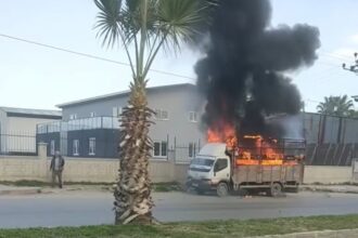 Mersin’de kasası alev alan kamyoneti ile bir süre ilerleyen sürücü, aracı daha…