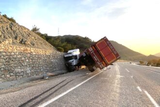 Doğanşehir Erkenek mevkiinde sürücüsünün direksiyon hakimiyetini kaybettiği tır yoldan çıkarak devrildi, sürücü…