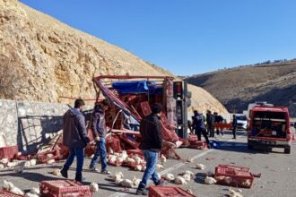 Akçadağ’da tavuk yüklü kamyon devrildi, yüzlerce tavuk telef oldu, sürücü yaralandı.