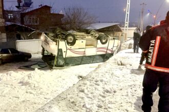 Buzlanma nedeniyle kontrolden çıkan işçi servisi alt yola devrildi, 9 işçi hafif…