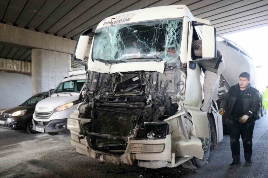 Sakarya’nın Arifiye ilçesi D-100 karayolunda seyir halindeki tıra, başka bir tır arkadan çarptı. Hurdaya dönen tırın sürücüsü, kazadan hafif yaralı olarak kurtuldu.