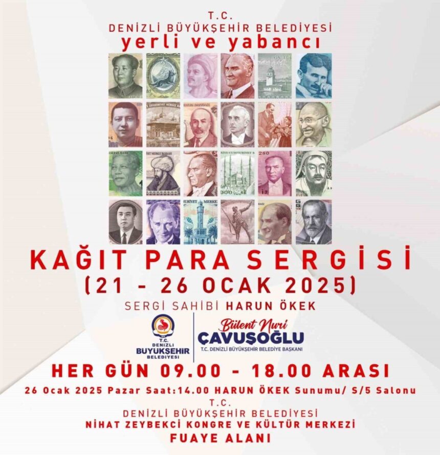 Denizli Büyükşehir Belediyesi, koleksiyoner Harun Ökek’in elindeki yerli ve yabancı ülkelerin kağıt paralarının yer aldığı ‘Kağıt Para Sergisi’ni Denizlililerle buluşturuyor. Sergi 26 Ocak Pazar gününe dek Nihat Zeybekci Kongre ve Kültür Merkezi’nde beğeniye sunulacak.