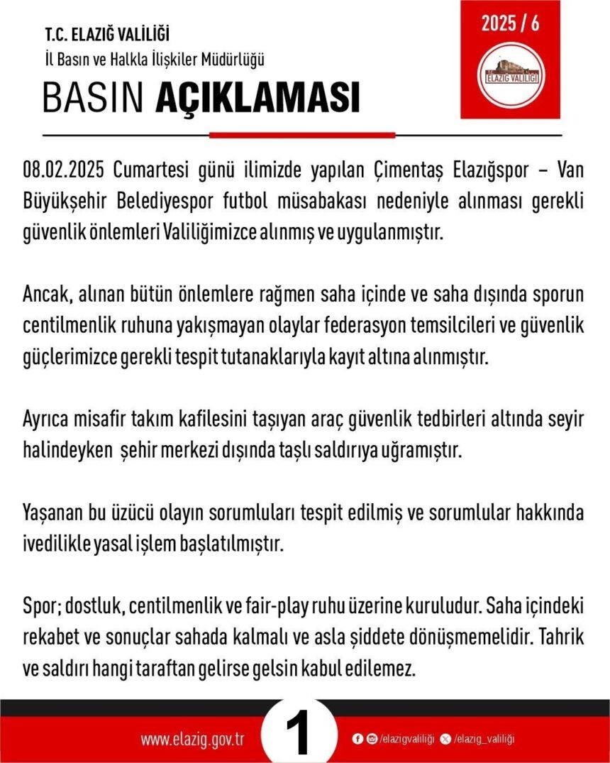 Valilikten yapılan açıklamada, “08.02.2025 Cumartesi günü ilimizde yapılan Çimentaş Elazığspor – Van Büyükşehir Belediyespor futbol müsabakası nedeniyle alınması gerekli güvenlik önlemleri Valiliğimizce alınmış ve uygulanmıştır. Ancak, alınan bütün önlemlere rağmen saha içinde ve saha dışında sporun centilmenlik ruhuna yakışmayan olaylar federasyon temsilcileri ve güvenlik güçlerimizce gerekli tespit tutanaklarıyla kayıt altına alınmıştır. Ayrıca misafir takım kafilesini taşıyan araç güvenlik tedbirleri altında seyir halindeyken şehir merkezi dışında taşlı saldırıya uğramıştır. Yaşanan bu üzücü olayın sorumluları tespit edilmiş ve sorumlular hakkında ivedilikle yasal işlem başlatılmıştır. Spor; dostluk, centilmenlik ve fair-play ruhu üzerine kuruludur. Saha içindeki rekabet ve sonuçlar sahada kalmalı ve asla şiddete dönüşmemelidir. Tahrik ve saldırı hangi taraftan gelirse gelsin kabul edilemez. Spor sahalarında ve dışında gerçekleşen hiçbir şiddet olayına fırsat verilmeyecek, toplumsal düzenin, birlik ve beraberliğin zedelenmesine yönelik davranışlara müsamaha gösterilmeyecektir. Spor kültürümüze, kulüplerimize ve şehirlerimize zarar veren bu tür olaylara karşı, sporun birleştirici gücüne inanan ve fair-play anlayışını benimseyen herkesin duyarlı olması gerektiğini bir kez daha hatırlatıyoruz. Yaşanan olaylardan duyduğumuz üzüntüyle birlikte Van Büyükşehir Belediyespor sporcu ve teknik heyetine geçmiş olsun dileklerimizi iletiyoruz. Sporun centilmenlik ruhuna yakışmayan bu tür davranışlara karşı taviz verilmeyeceğini bir kez daha vurguluyor, tüm taraftarlarımızı sağduyuya davet ediyoruz” denildi.