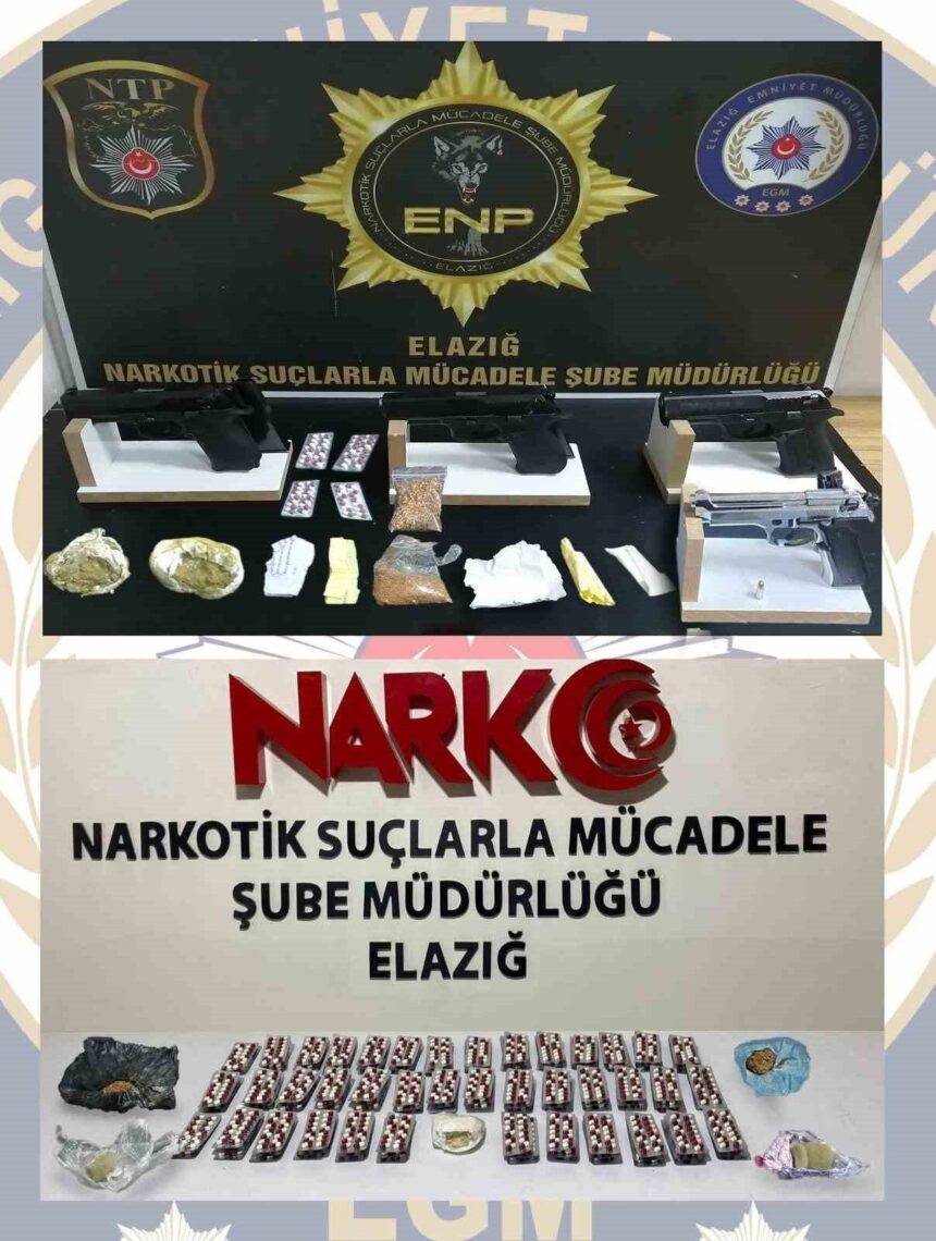 Elazığ Cumhuriyet Başsavcılığı koordinesinde, İl Emniyet Müdürlüğü Narkotik Suçlarla Mücadele Şube Müdürlüğü ekipleri tarafından son bir hafta içerisinde düzenlenen uyuşturucu operasyonlarında önemli miktarda uyuşturucu madde ve silah ele geçirildi. Gerçekleştirilen operasyonlarda, 227,45 gram sentetik kannabinoid, 159,54 gram esrar, 4 parça halinde 7,14 gram metamfetamin, bin 694 adet sentetik ecza maddesi, 4 ruhsatsız tabanca ve bu tabancalara ait 40 fişek ele geçirildi. Olaylarla ilgili toplam 15 şüpheli gözaltına alındı.