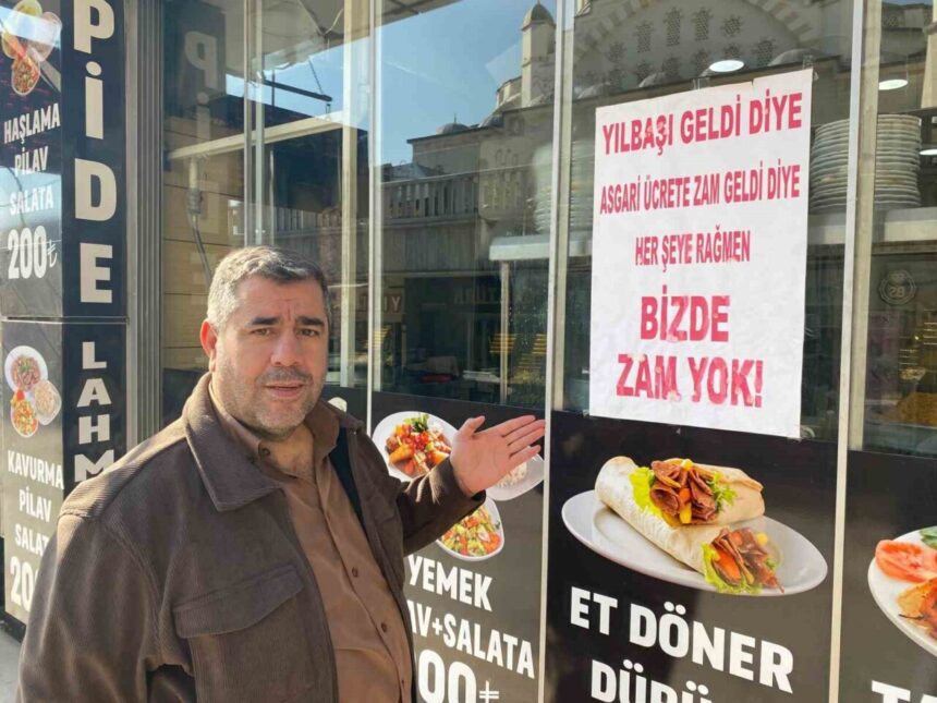 Yeni yılda asgari ücret 22 bin 104 TL olarak belirlendi. Bazı kesimler yılbaşı ve asgari ücretteki artışı fırsat bilerek fahiş fiyat uygularken Elazığ’da lokantası bulunan Murat Karatapan ise örnek bir davranış sergiledi. İş yerinin girişine, ’Yılbaşı ve asgari ücrete zam geldi diye her şeye rağmen bizde zam yok’ yazısı asan Karatapan, yapılan zamlara karşı lokantasındaki yemek fiyatlarını 2024 listesi ile aynı tutarak, zam ve fahiş fiyat uygulayan kesime karşı tavrını korudu. Karatapan aynı zamanda iş yerinde boykot ürünlerini de satmadığını ifade etti.