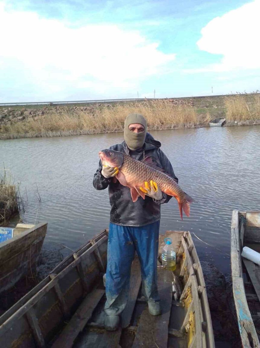 Edirne’nin Enez ilçesindeki Gala Gölü’nde 2 kardeş, attığı ağlar ile 18 kiloluk sazan balığı yakaladı.