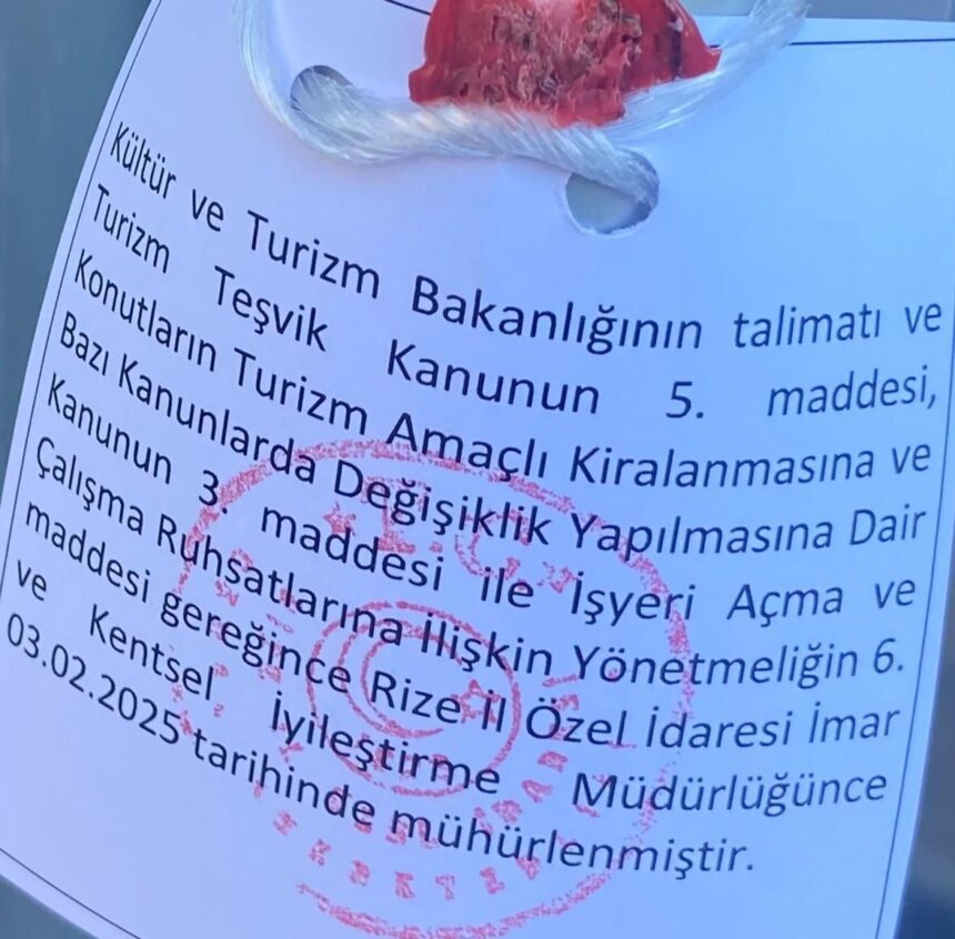 Kültür ve Turizm Bakanlığı Rize’de Fırtına Vadisi’nde ruhsatsız konaklama tesislerine karşı harekete geçti. Bakanlığın valiliklere gönderdiği yazının ardından turizm işletme belgesi olmayan ve kayıt dışı faaliyet gösteren tesisler tek tek mühürlenmeye başladı.