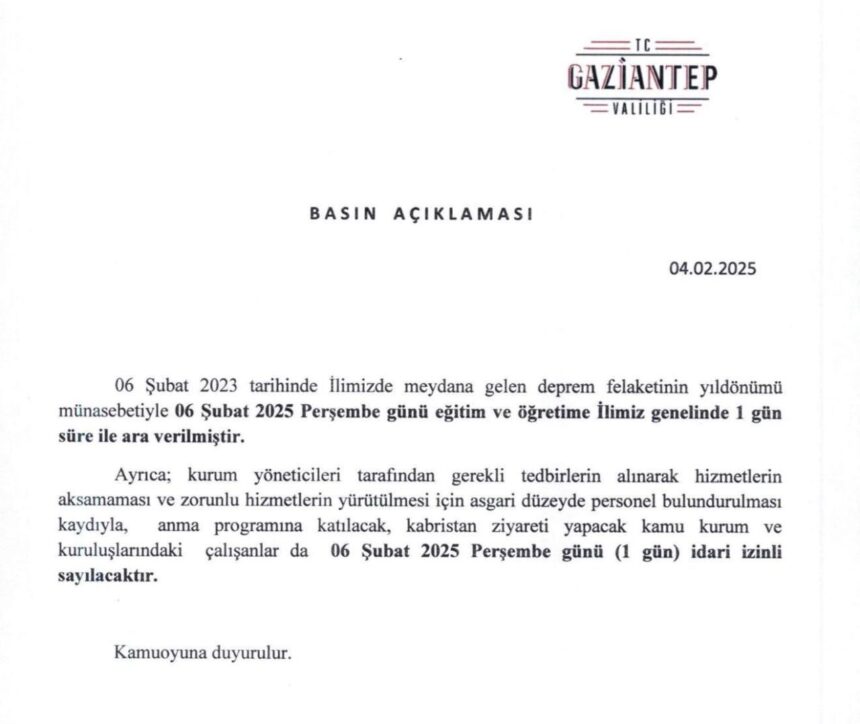 Konu ile ilgili Gaziantep Valiliğinden yapılan açıklamada, “6 Şubat 2024 tarihinde meydana gelen ve ilimizin de etkilendiği Kahramanmaraş merkezli depremlerin 2. yıl dönümü münasebetiyle İlimizde eğitim ve öğretime 1 gün süre ile ara verilmiştir. Ayrıca kamu kurum yöneticileri tarafından gerekli tedbirlerin alınarak hizmetlerin aksamaması ve zorunlu hizmetlerin yürütülebilmesi için asgari düzeyde personel bulundurulması kaydıyla anma programlarına katılacak, kabristan ziyareti yapacak kamu kurum ve kuruluşlarındaki çalışanlarda 6 Şubat 2025 Perşembe günü 1 gün idari izinli sayılacaktır” ifadelerine yer verildi.