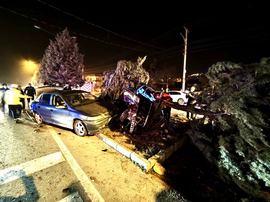 Bir aracın çarpmanın etkisiyle orta refüje çıkarak bir ağacı devirdiği anlar, bölgedeki bir iş yerinin güvenlik kamerasına saniye saniye yansıdı.