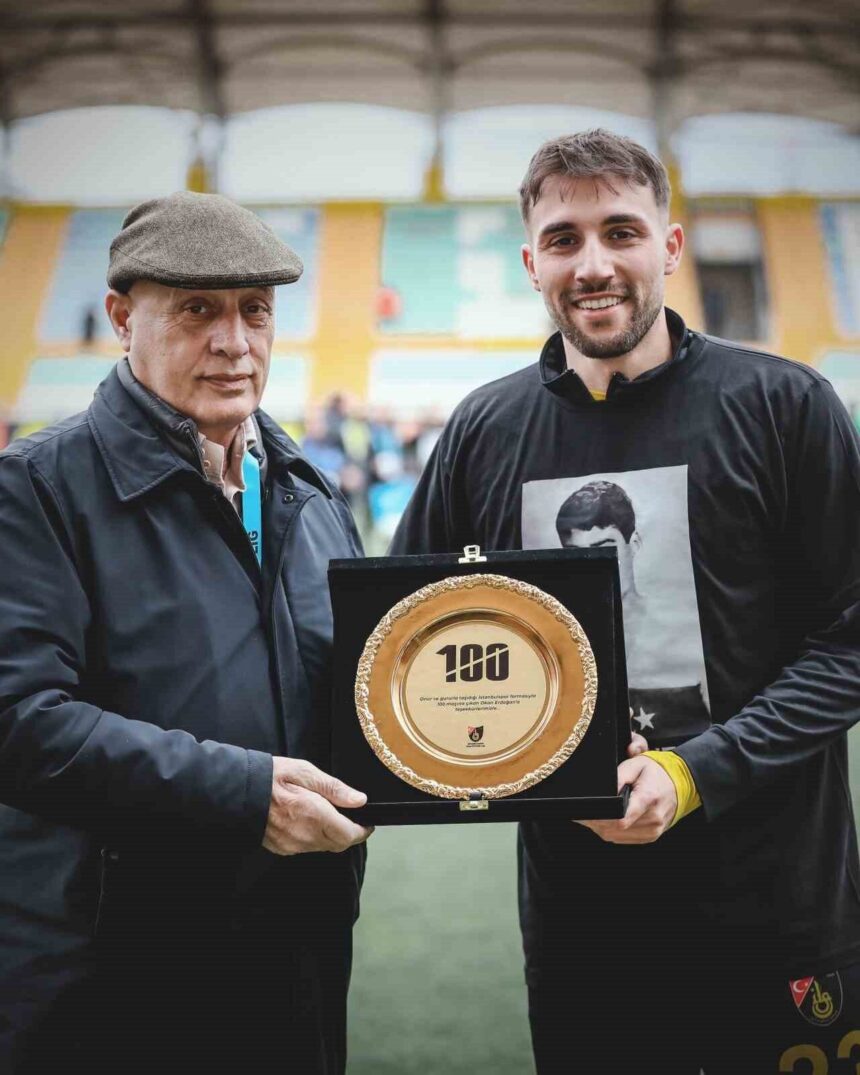 Okan’a karşılaşma öncesi İstanbulspor Başkanı Ecmel Faik Sarıalioğlu tarafından plaket takdim edildi.