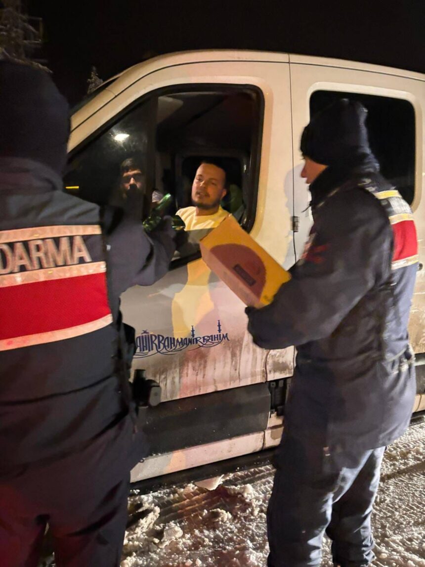 Etkili olan kar yağışı ve olumsuz hava koşulları nedeniyle uzun süre yolda beklemek zorunda kalan sürücü ve yolcuların mağduriyet yaşamaması için sahaya çıkan jandarma ekipleri, kapanan yol güzergâhında yardım çalışmalarında bulundu.