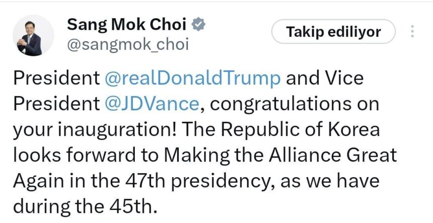 Güney Kore Geçici Devlet Başkanı Choi Sang-mok ise, Trump’ın yanı sıra ABD Başkan Yardımcısı James David Vance’e de tebriklerini iletti. Trump’ın “Amerika’yı yeniden harika yap” (MAGA) sloganına ve görevdeki ilk dönemine atıfta bulunan Choi, “Kore Cumhuriyeti, 45. başkanlık döneminde olduğu gibi 47. başkanlık döneminde de ‘ittifakı yeniden harika yapmayı’ dört gözle bekliyor” ifadelerini kullandı.