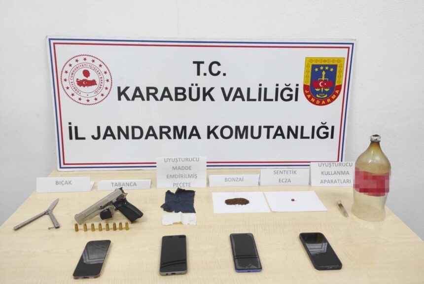 Edinilen bilgiye göre, İl Jandarma Komutanlığı ekipleri tarafından il merkezi ve Safranbolu ilçesinde yapılan iki farklı operasyon düzenlendi. Operasyonda 6 şahsın üzerinde, eşyalarında, aracında ve ikametlerinde yapılan aramada, 3 adet çeşitli ebatlarda uyuşturucu madde emdirilmiş kağıt, 6,9 gram sentetik kannabinoid bonzai maddesi, birer adet sentetik ecza hap, kuru sıkı tabanca, şarjör, 8 adet fişek, 1 adet bıçak, 2,5 gram metamfetamin, 4 adet uyuşturucu kullanma aparatı ele geçirilirken, 4 adet cep telefonuna ise incelenmek üzere el konuldu.
