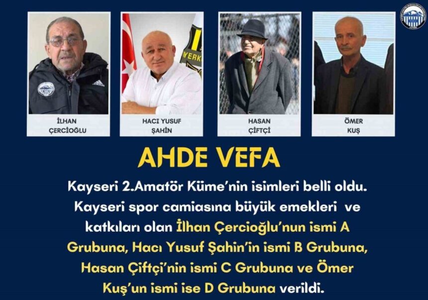 Kayseri Amatör Spor Kulüpleri Federasyonu, ahde vefa hareketi olarak il genelinde oynanan futbol liglerine emektar spor adamlarının isimlerini vermeye devam ediyor. Süper Amatör Küme ve Birinci Amatör Küme’nin ardından son olarak Kayseri İkinci Amatör Küme’de fikstürle belirlenen gruplara verilecek isimler belli oldu. ASKF’den yapılan açıklamaya göre A Grubu’na Burhan Çerçioğlu, B Grubu’na Hacı Yusuf Şahin,C Grubu’na Hasan Çiftçi ve D Grubu’na Ömer Kuş isimleri verildi. Burhan Çerçioğlu, Kayseri İdman Yurdu ile Kayseri futboluna birçok önemli isim kazandırmıştı. Hacı Yusuf Şahin ise Yerköyspor Spor Kulübü ile önemli hizmetlere imza attı.
