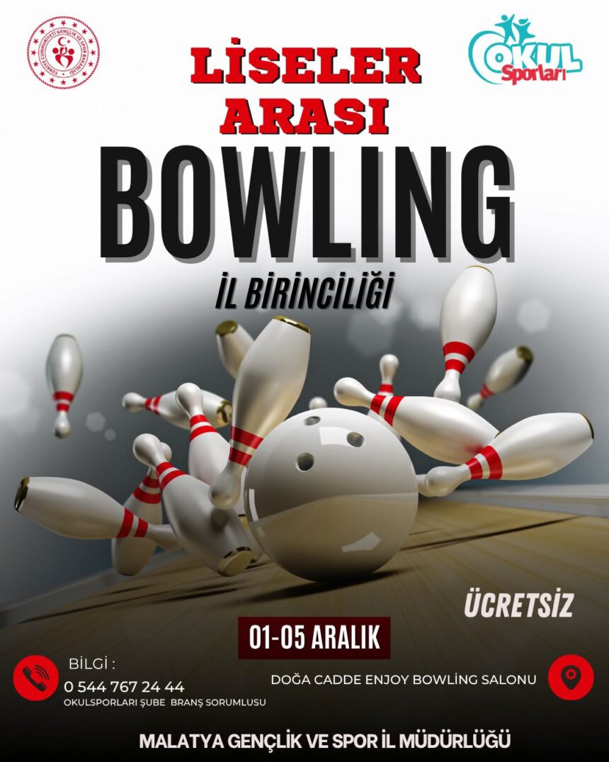 Malatya Gençlik ve Spor İl Müdürlüğü Okul Sporları Şubesi tarafından düzenlenen Liseler Arası Bowling İl Birinciliği Müsabakaları, 1–5 Aralık tarihleri arasında Doğa Cadde Enjoy Bowling Salonu’nda gerçekleştirilecek.