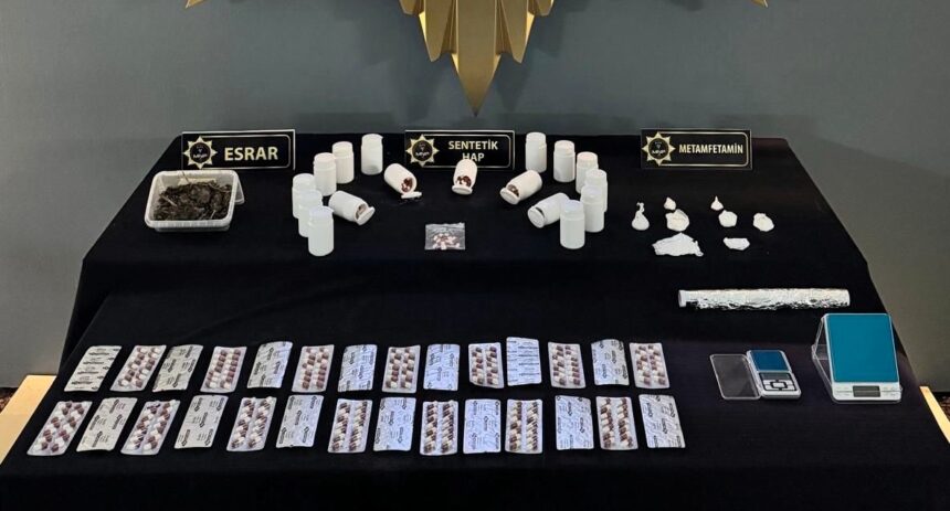 Yaklaşık 3 ay süren teknik ve fiziki takip sonucunda delillendirmesi tamamlanan 14 şüpheliye ait adreslere gerçekleştirilen operasyonda, bin 340 adet sentetik ecza hap, 140 gram esrar, 48,5 gram metamfetamin ve 2 adet hassas terazi ele geçirildi.