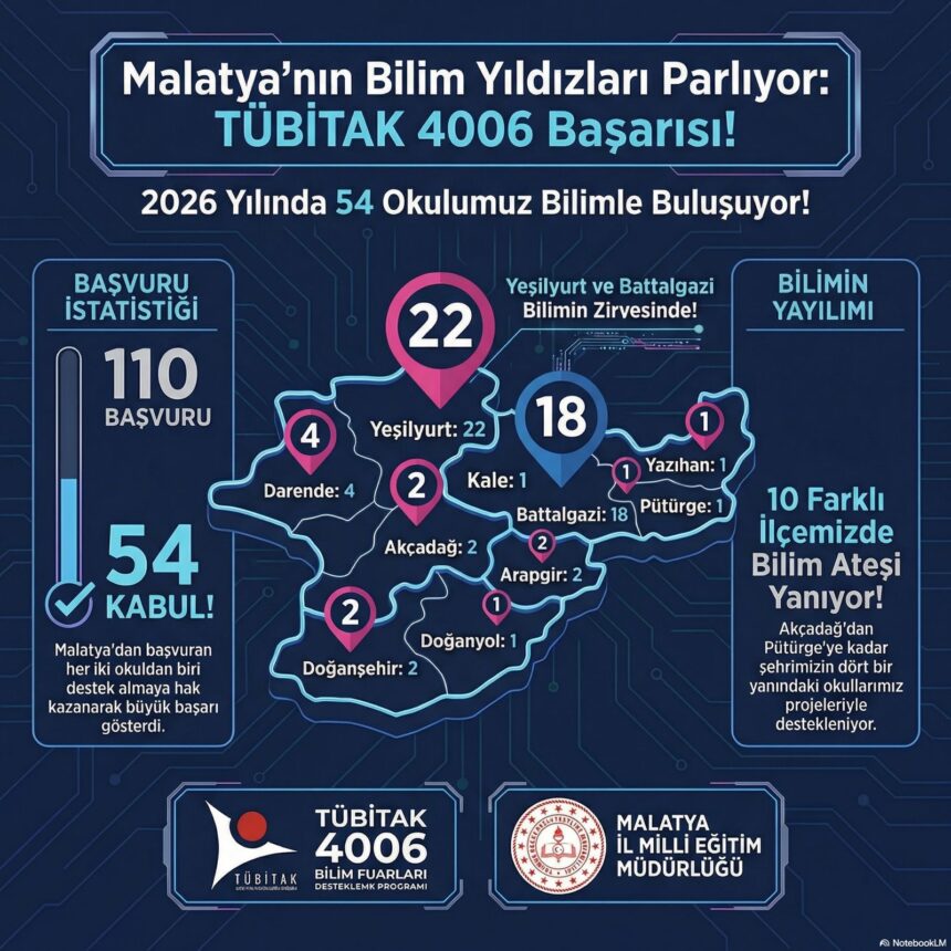 TÜBİTAK tarafından öğrencileri düşünmeye, araştırmaya, gözlem yapmaya ve bilimsel üretime teşvik etmek amacıyla yürütülen 4006 Bilim Fuarları Programı kapsamında açıklanan sonuçlarda Malatya’nın yüksek kabul oranıyla dikkat çektiği belirtildi.