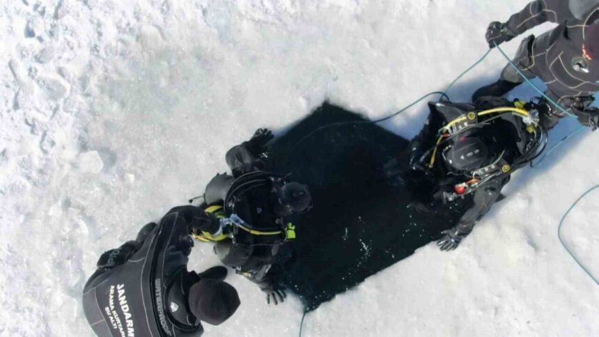 Erzurum İl Jandarma Komutanlığı Sualtı Arama Kurtarma (SAK) Tim Komutanlığı, zorlu kış şartlarında görev bilinciyle buz tutmuş Tekederesi Göleti’nde dalış eğitimi gerçekleştirdi.