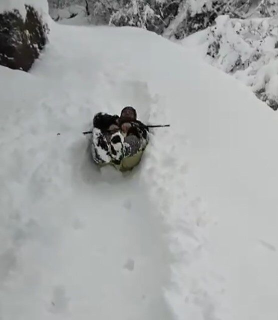 Kastamonu’nun Çatalzeytin ilçesinde 80 santimetreyi bulan kar kalınlığında canı sıkılan teyze, eline aldığı çuvalla kaydı.